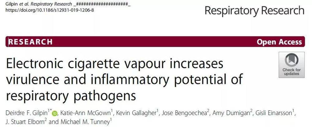 [1] Gilpin et al. (2019) Electronic cigarette vapour increases virulence and inflammatory potential of respiratory pathogens. Respiratory Research. DOI: 10.1186/s12931-019-1206-8