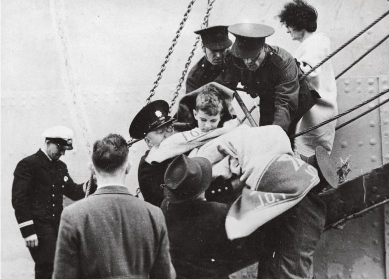 “雅典娜”号客轮的幸存者正被送下甲板。1939年9月3日,二战爆发后不久,英国客轮“雅典娜”号即被德国潜艇用鱼雷击沉,112名乘客遇难(其中28人为美国人)
