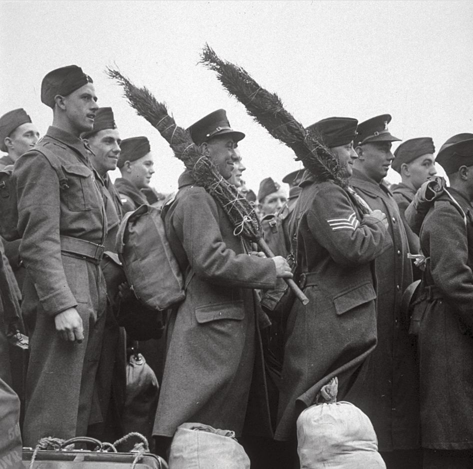 1939年12月20日,一群英国士兵抵达兵站,准备开拔,其中两人还扛着圣诞树。虽然此时二战已经爆发,但英、法两国对德作战意志不强,躲在马其诺防线的背后坐视德国攻城略地,前线将士也沾染了厌战情绪,宁可静坐度过圣诞节也不愿意发起攻击