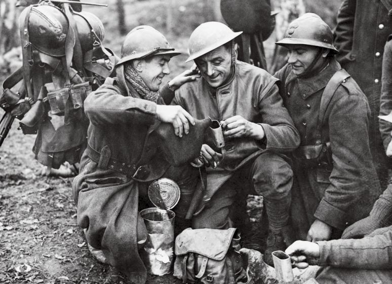 1939年12月30日,正在马其诺防线后“静坐战”的英(中)法(左、右)军士兵相互举杯庆祝新年
