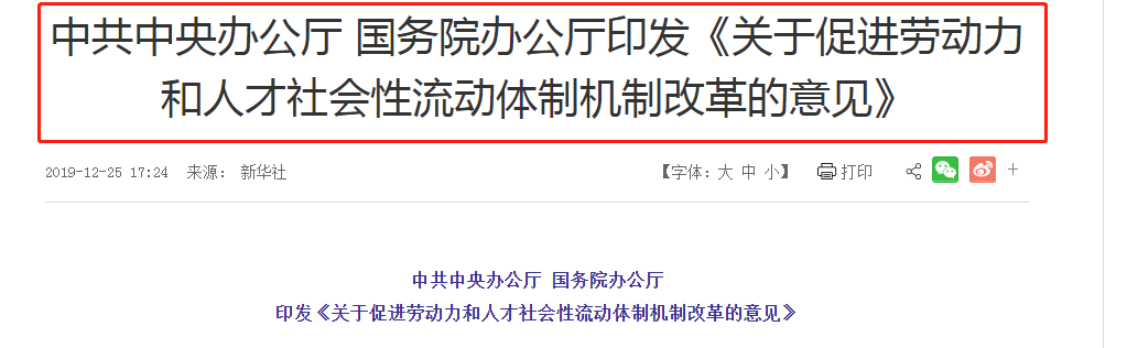 就在昨天,12月25日中共中央办公厅、国务院办公厅印发了《关于促进劳动力和人才社会性流动体制机制改革的意见》。
