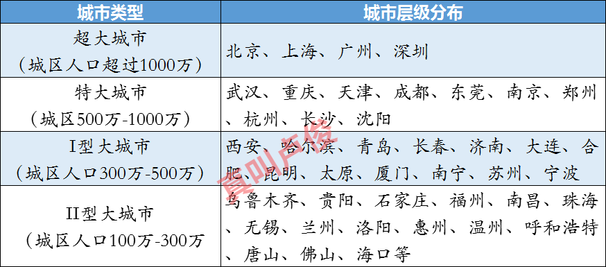 比如将300万以下城区常住人口的城市定义为II型大城市,将城区常住人口在300万~500万的城市定义为I型大城市,500万以上的人口定义为超大特大城市。