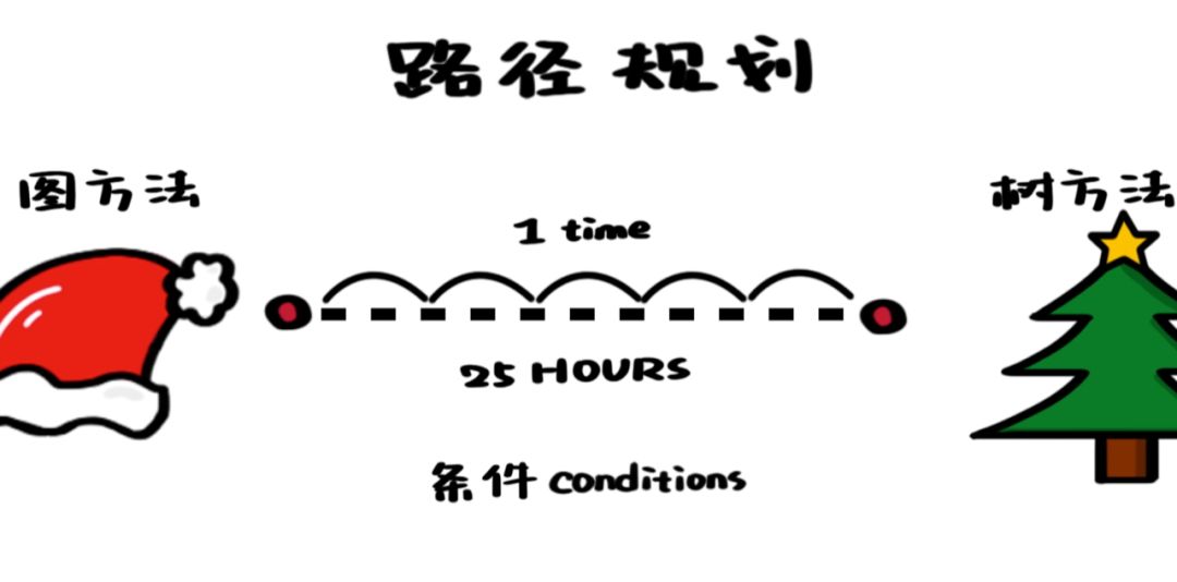 图方法即将所有必须经过的地点设为节点,可以通过的路径设置为线,依据条件寻找最优路径;树方法则是从起点开始向外拓展树状结构,随机踩点直到找到抵达终点的方法。