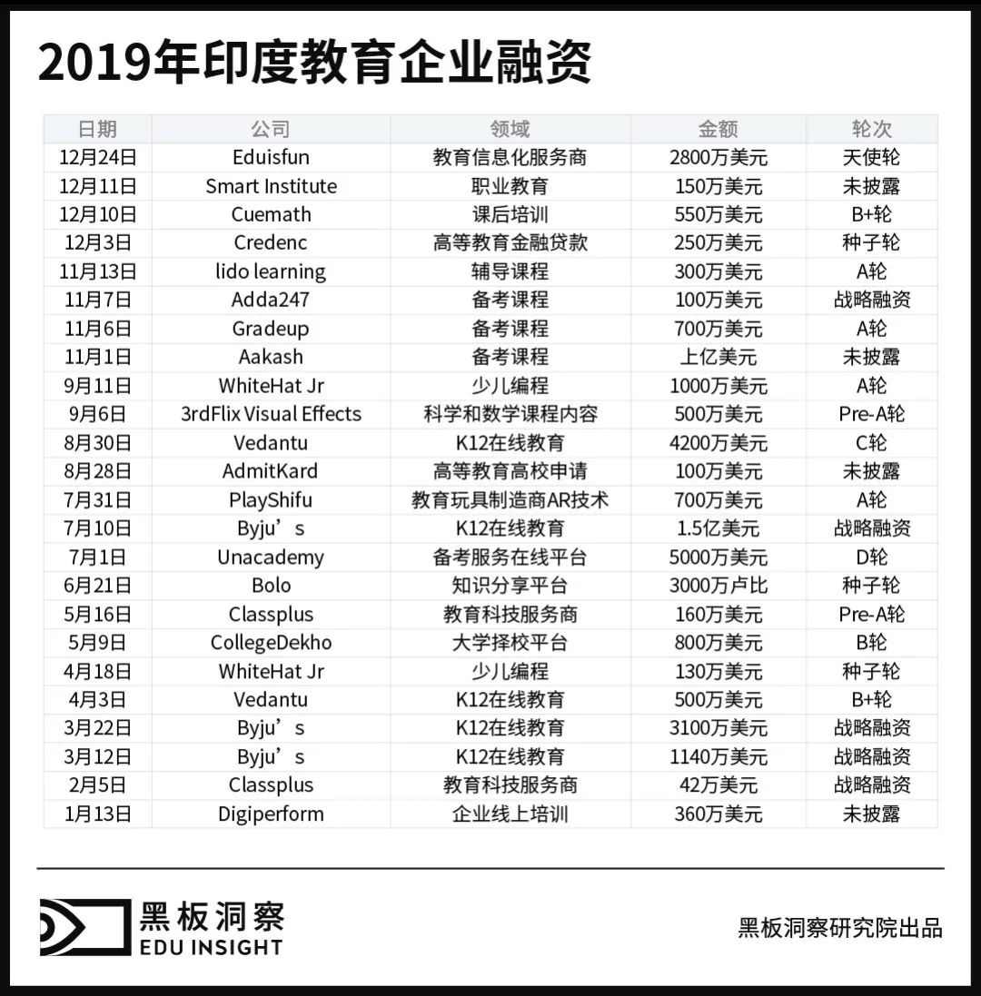 2019年Byju's获得了三轮融资,独角兽 Byju's 是印度 K12 在线教育平台中影响力最大、排名最高的产品,主要为在校学生提供原创学习内容、视频课程、以及互动教学活动。2017 年,Byju’s 获得了腾讯 4000 万美元的注资。除此之外,Byju’s 的投资方还包括红杉资本及Facebook 创始人马克扎克伯格夫妇创立的基金。