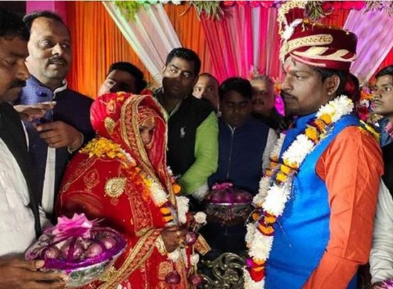 为抗议洋葱价格上涨,印度一对新婚夫妇特意选择在婚礼上用洋葱代替鲜花,为对方戴上洋葱“花环”。