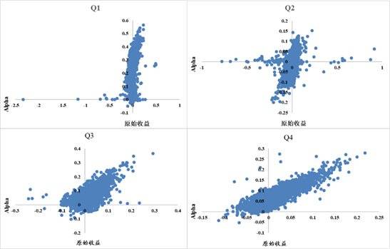 进一步的,当我们分别观察2019年四个季度基金Alpha收益与原始收益的关系时,四个季度表现存在明显的差异。