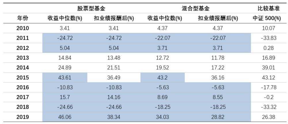 基于对自2010年以来,A股市场中股票型、混合型基金的业绩表现,以及五个主要宽基指数同期的收益状况统计,我们单独将把、各类基金业绩表现的中位数提取出来,与代表性指数比较,观察主动管理相对被动指数的相对优势在不同市场环境下的变化。