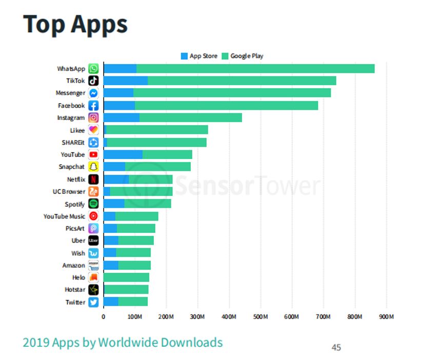 尽管监管麻烦不断,TikToK仍然以不可逆转之势风靡全球。Sensor Tower数据显示,TikTok成为全年下载量排名第二的应用,仅次于WhatsApp。根据App Annie《2020移动市场报告》,TikTok全球使用时长同比增长210%。
