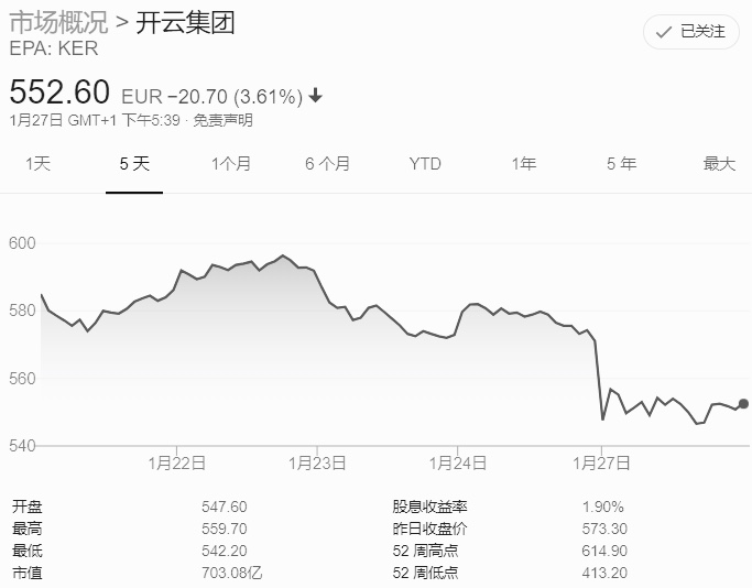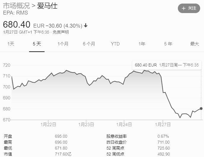 图为LVMH、开云集团和爱马仕近5日的股价波动