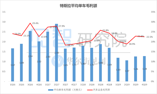 19Q4,特斯拉共实现毛利润13.9亿美元,环比增长16.8%,同比下降3.6%。