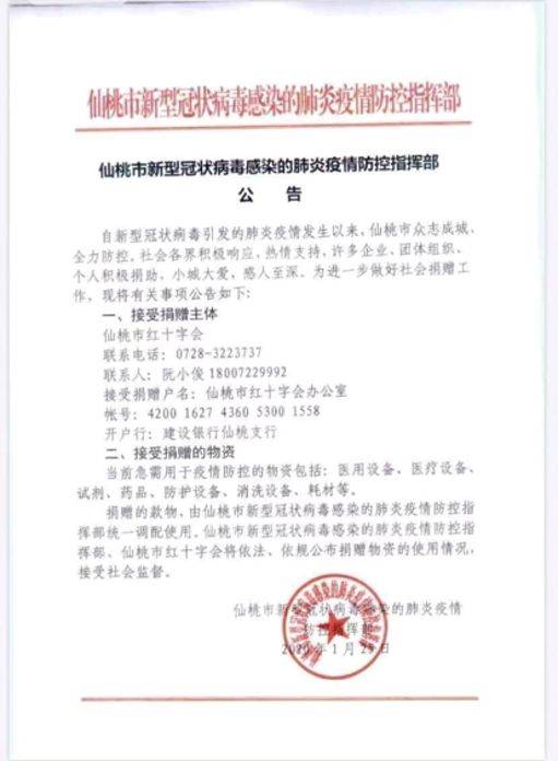 图为仙桃市第一人民医院及仙桃市红十字会发布的公告