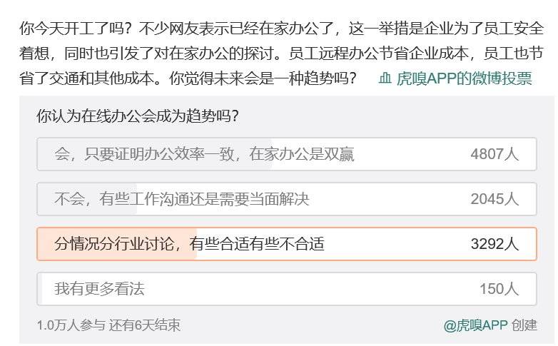 在1万人参与的虎嗅APP发起的“你认为在线办公会成为趋势吗?”的投票中,将近一半的网友认为只要证明办公效率一致,在家办公是双赢;1/5的网友认为在线办公只是疫情之下的昙花一现,有些工作沟通还是需要当面解决。