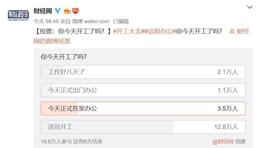 17年后,新型冠状病毒又一次让在线办公成为了热点话题。在财经网关于节后复工的投票中,有7.6万人表示已经开始上班,其中有3.5万人明确表示自己在家办公。在2.1万表示自己“工作好几天了”的用户当中,说不定也有相当比例的在线工作者存在。