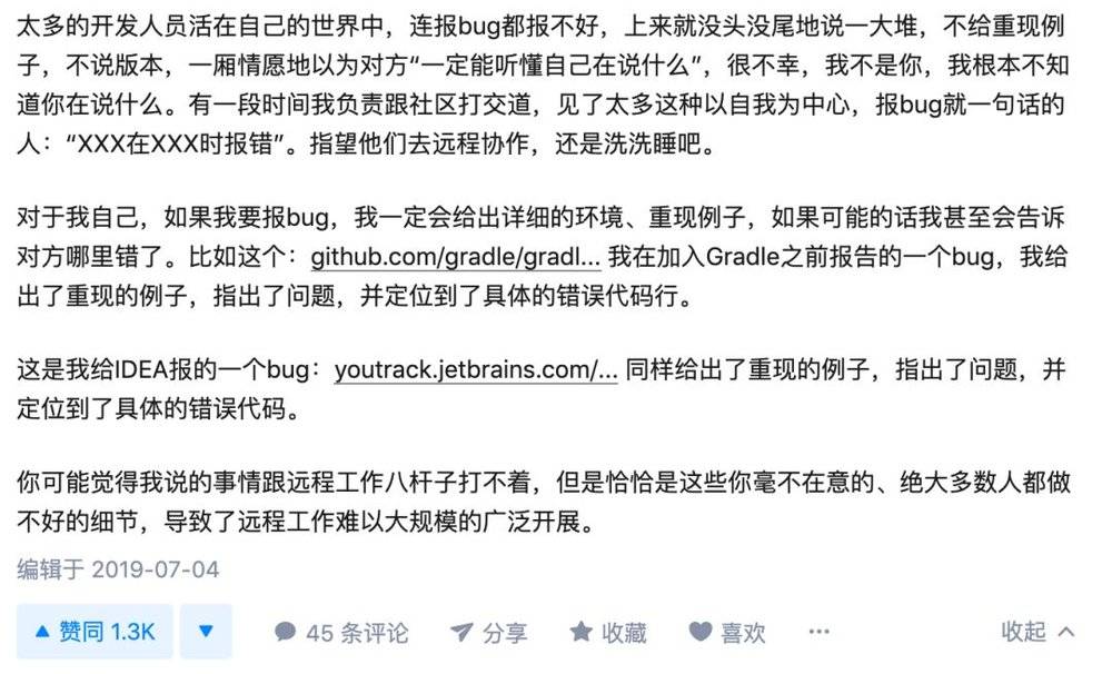 对于远程办公的沟通效率问题,在互联网初创公司工作的知乎用户blindpirate给出了一个新的思考角度。Blindpriate所在的公司从创始至今已经坚持了十年的全员远程办公 。他认为远程办公在技术上没有问题,沟通效率的低下本质上是许多人缺少“一句话将一件事情说清楚“的沟通素质,对这种能力的忽视在远程办公的工作模式中显露无疑。