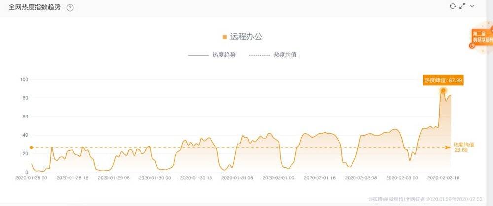 “远程办公”瞬间成了微博上一大热词,热度峰值一度达到88,远超26.7的热度均值。