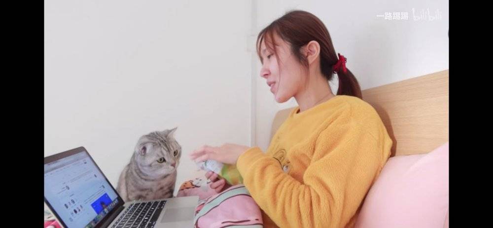 在一路踢踢上传的在家办公vlog里,她给粉丝们展示了在床上穿着睡衣、吃着零食撸着猫的远程工作会议时光。