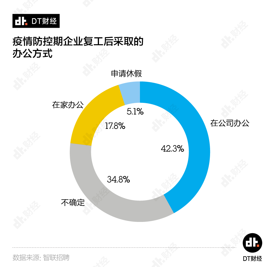 这些“明确”和“观望”也都体现在了智联招聘的一份调查中。调查显示,针对此次疫情下的复工,17.8%的公司倾向于在家办公,34.8%的公司尚未决定工作模式,但仍有42.3%的公司仍倾向于在公司办公。这也说明至少7成公司仍对远程办公这一工作模式持观望态度。