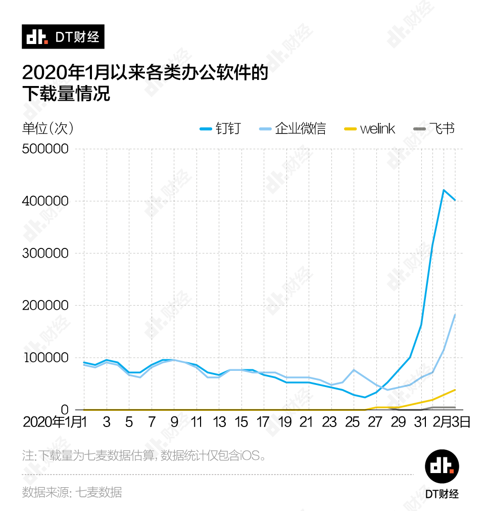但在1月25日前后,前三款主流办公软件的日下载量都有明显的提升。这数据也可以说明,部分公司的管理层已经意识到节后无法正常开工,需要一款软件帮助企业提高效率。