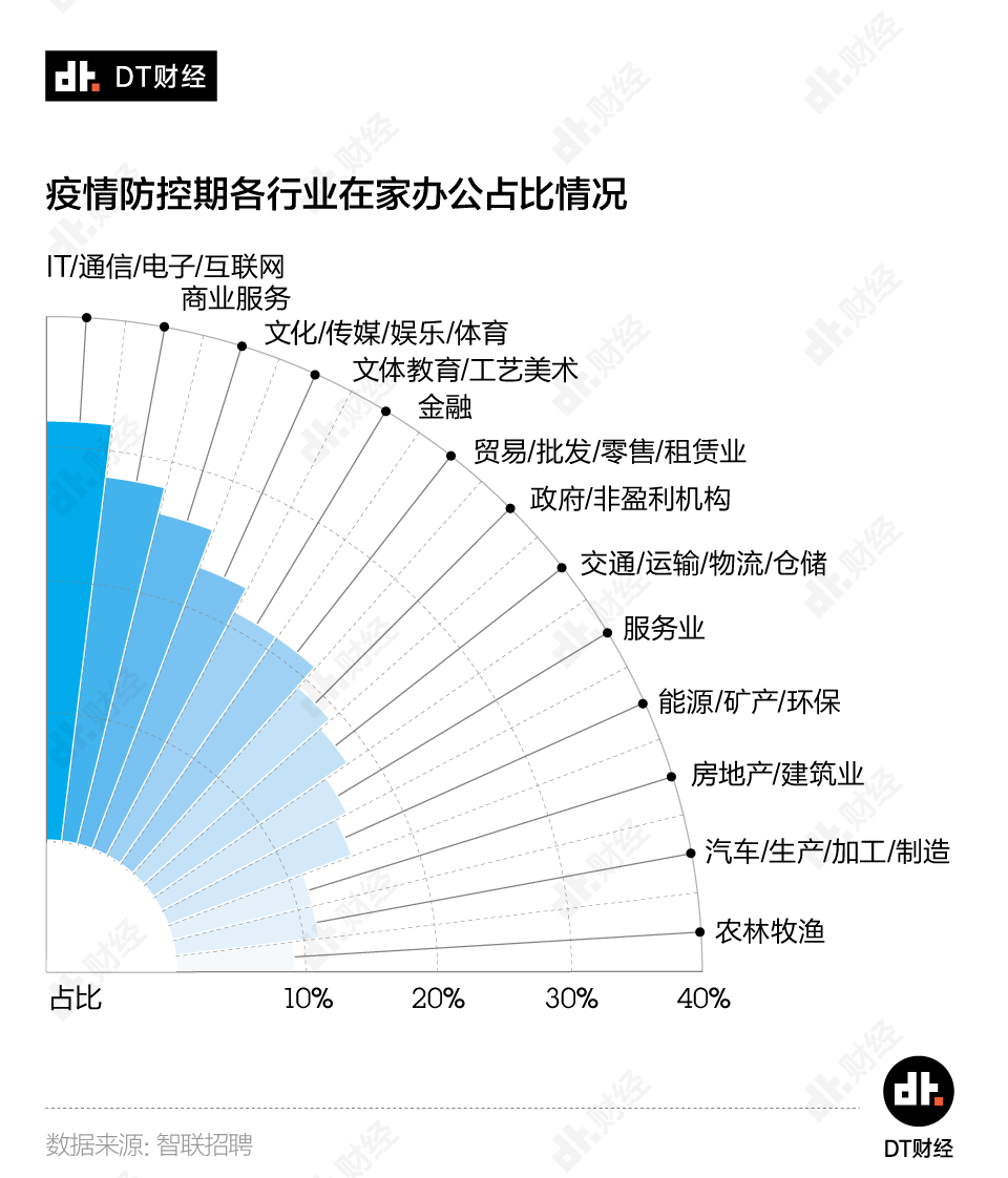 智联招聘的调研数据显示,在这个特殊时期选择在家办公的行业占比呈现很大的差异。通信电子、互联网行业选择在家办公的比例最高,超过30%,其次商业服务、文化传媒和娱乐体育行业的在家办公比例也超过25%。而传统行业的在家办公比例则相对较低,占比倒数的行业包括农林牧渔、汽车和房地产、建筑业。