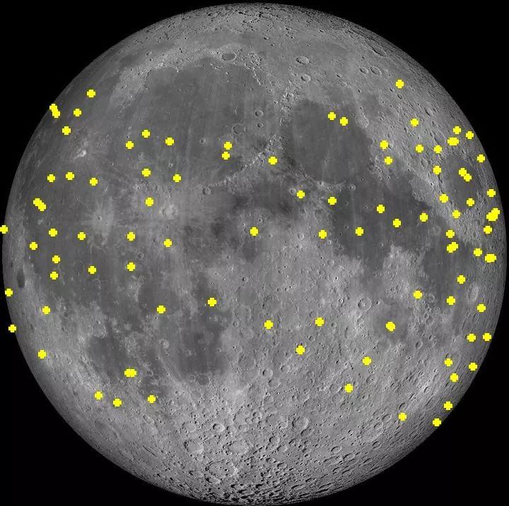 2009年至2015年里月球上222个新形成的撞击坑分布(黄点)。红点是接下来会提到的两次月闪事件 | 参考文献 [13]