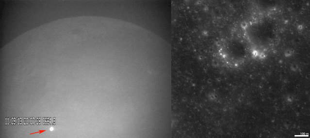 2013年9月11日MIDAS的0.36米望远镜记录的月闪(左)和LRO找到的新撞击坑(右)。来源:参考文献 [15, 16]