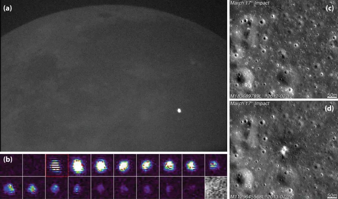 2013年3月17日的月闪记录(左)和LRO探测器通过比对2012年2月12日和2013年7月28日的局部高清月面影像找到的新撞击坑(右) | 参考文献 [14]
