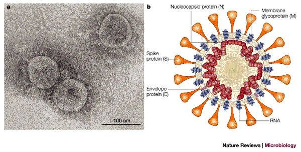 图2。SARS病毒在电子显微镜下呈现类似”王冠”状的形态(a),以及SARS病毒结构示意图(b). 棘突蛋白 (spike蛋白,又称S蛋白) 在a中可见于病毒表面,在b中用橙色标示。图片来自参考文献[14]