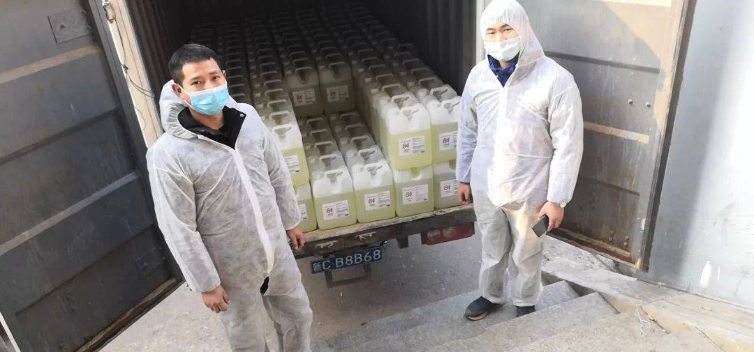 涂振雍(右)抵达武汉工厂装好200罐消毒水。