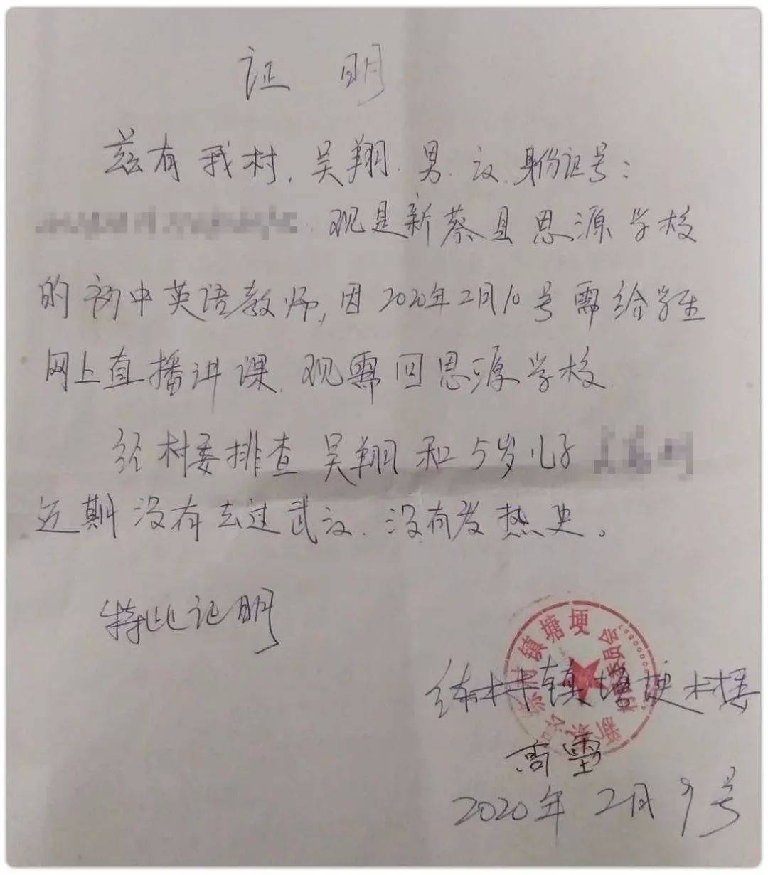 新蔡思源学校的英语老师吴翔和周华玮一样,平时住在学校,和同学们同吃同宿。正月初九接到学校“停课不停学”的通知后,吴翔就暗自着急。吴翔春节在老家过年,乡里没电脑没网,他必须得赶回学校才能上直播课。为了通过关卡,吴翔专门去找村委会开了证明。农历正月十七,吴翔下午3点从老家河南练村镇出发。他开着自己的电动四轮车。正常情况,一个小时就能回到新蔡思源学校,但吴翔这天却足足花了5个小时。