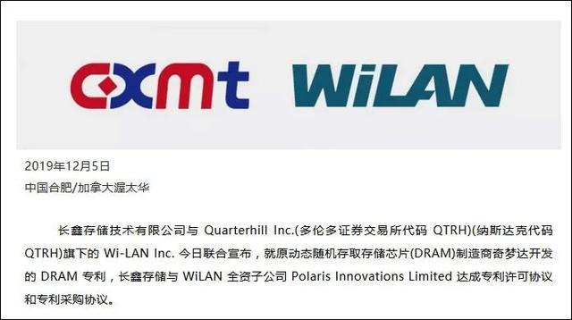 同年12月5日,Polaris Innovations Limited的母公司Wi-LAN Inc.将这些专利打包卖给了中国的合肥长鑫,双方均没有披露具体的成交金额。