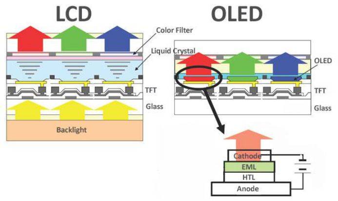 目前屏幕技术主要分为 LCD 与 OLED 两大类,LCD 屏幕的像素不能自主发光,需要有背光光源照射液晶,从而显示画面;而 OLED 屏幕每一个单独的像素点都可以自发光,因此 OLED 有着更好的色彩、对比度,同时更薄,能被做成柔性、曲面、折叠等多种形态,也是目前主要高端产品采用的技术。