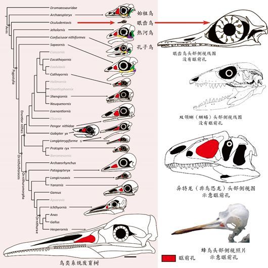 论文作者对这件标本完全缺失眶前孔是有解释的:“因为头骨小型化,导致眶前孔丢失。”[1]可是,这件标本既然大小和蜂鸟头骨相仿,那蜂鸟的眶前孔是否也丢失或退化呢?事实上,各种蜂鸟的眶前孔全部都完完整整地保留着。可见,这种解释不太站得住脚。