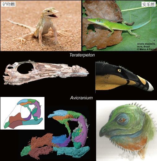 可是,这些形状,在爬行动物中并非只有鸟才有。趋同演化现象很常见:亲缘关系迥异的不同动物,经常会演化出非常接近的外形。蜥蜴中的铲吻蜥(Meroles anchietae)、安乐蜥类(例如Anolis dissimilis),吻部都有不同程度的加长;主龙类中的Avicranium renestoi[2]和Teraterpetonhrynewichorum[3],这些和鸟类/恐龙亲缘关系甚远的爬行动物,也有嘴尖而长、鼻孔后移、大眼等头型,因此,仅仅基于这些连续形状的相似性,无法得出标本属于鸟/恐龙的结论,继而无法演绎出一系列后续意义,何况还有一些重要的解剖特征指示着这件标本属于蜥蜴的可能性。