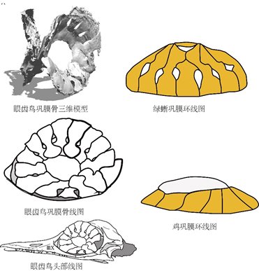 图8. 巩膜骨形态对比。对比可见眼齿鸟的巩膜骨与绿蜥巩膜骨形状相似,而与鸡巩膜骨极为不同。