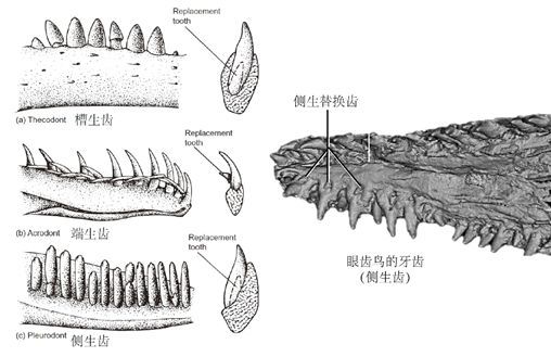 图6. 爬行动物牙齿着生方式[4] 。左列从上至下依次为:槽生齿、端生齿、侧生齿。右图是眼齿鸟的牙齿,为侧生齿。