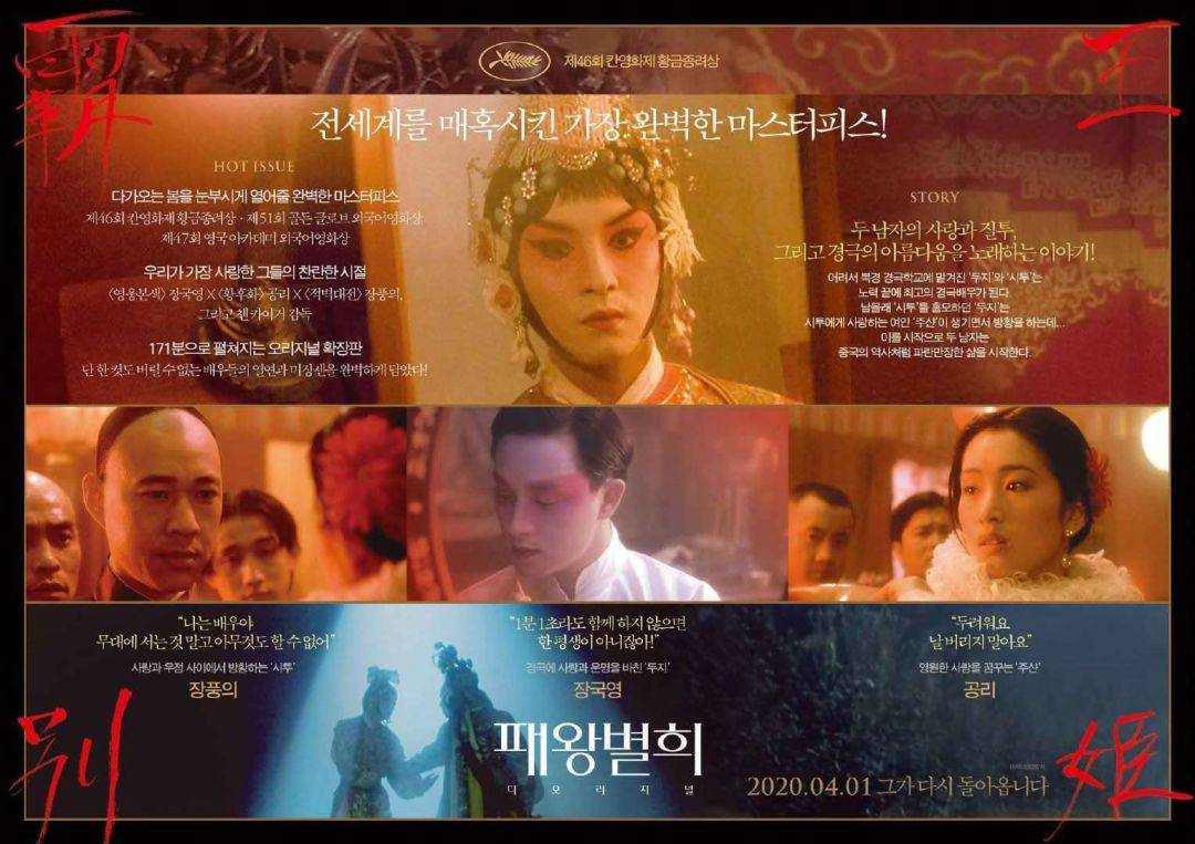 今年4月1日,韩国院线将再度重映《霸王别姬》。定档海报用的是张国荣饰演的程蝶衣在影片中唱贵妃醉酒的扮相。