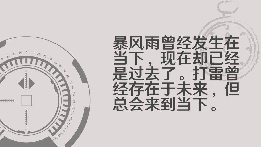 但除此之外,A序列包含一种特别的事件:“当下”。它把更早发生的事情标为“过去”,更晚发生的则是“未来”。如果闪电正在当下发生,那下雨就成为了过去,未来将会打雷。