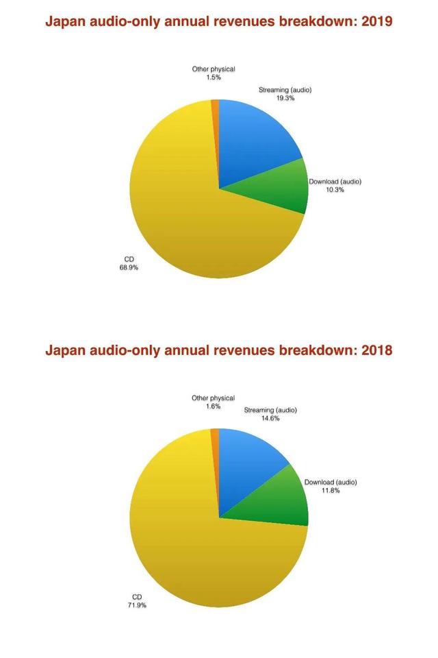 尽管如此,CD、蓝光光碟、黑胶为代表的实体唱片仍然是日本录制音乐的市场之王。数据显示,2019年,实体唱片的收入仅下降了3.0%,全年产生了惊人的1495.5亿日元(13.7亿美元)的收入,在整个音频音乐市场占比超过70%。