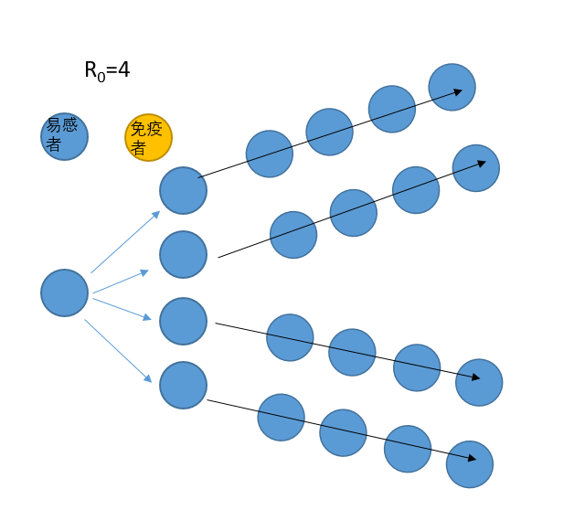 先来看一个比较简单的模型: 当R0=4时,也就是说,1个传播者可以传给4个易感者,接着这4个感染者又可以再传给16个易感者,如下图所示: