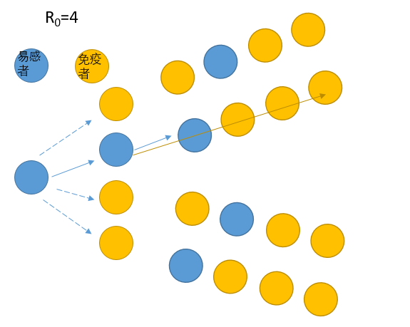 而此时,如果人群中刚好有75%的人获得了完美的免疫能力,则出现了一个有意思的现象(注意箭头的变化):