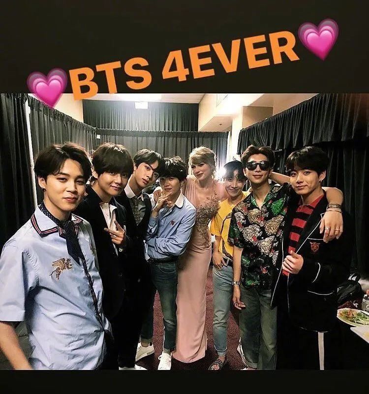 2018年的Billboard颁奖典礼上,歌后Taylor Swift在候场时跑去防弹少年团的休息室,并将与成员们的合影上传到Twitter上,附文“BTS 4EVER”。