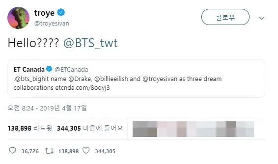 同样喜欢防弹少年团的戳爷(Troye Sivan),在参加综艺节目时表示自己在防弹的音乐中获得了很多灵感,但是苦恼不知如何取得联系,主持人建议他可以发个推特试试,最后戳爷如愿参与了防弹少年团新专辑的作曲。