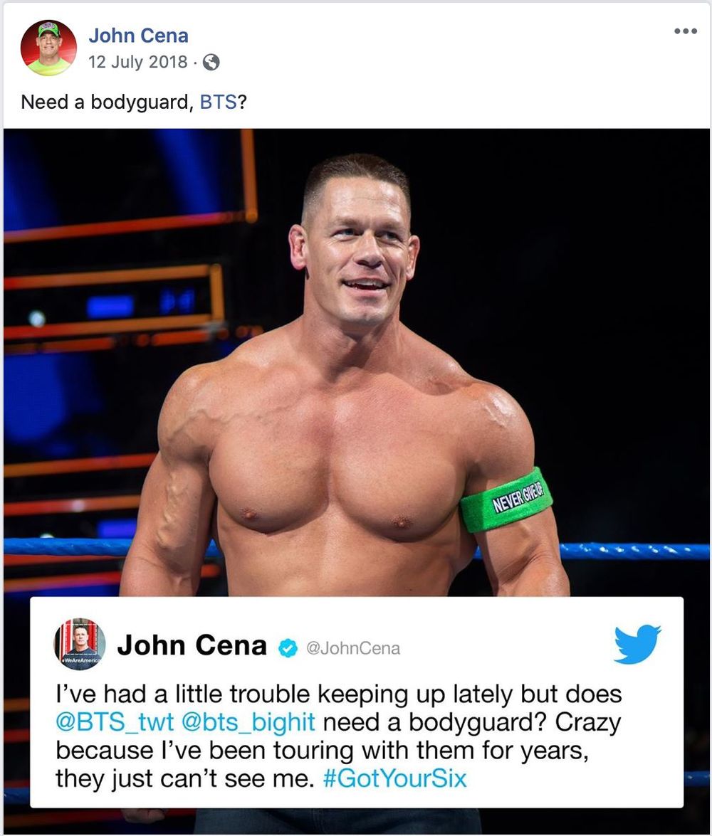 曾拿过16次世界冠军的美国摔跤巨星约翰希南(John Cena)竟然也在Twitter上给防弹少年团投票,还在Instagram上晒出成员郑号锡的照片,表示愿意应征防弹的保镖。