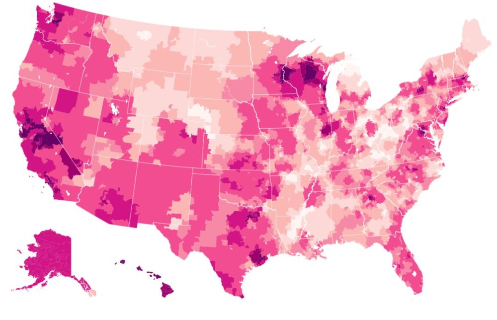 美国防弹粉丝分布图,颜色越深粉丝越多