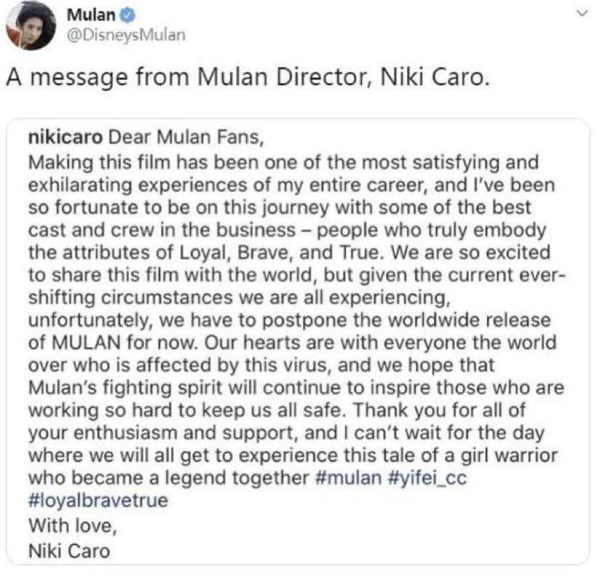 就在同一天,迪士尼还不得不忍痛取消了《花木兰》、《X战警:变种人》等大片的上映计划,这意味着数亿美元的票房收益被迫延后,前期数千万美元的宣发成本泡汤,并且损失还可能因为后续影片撤档而扩大。
