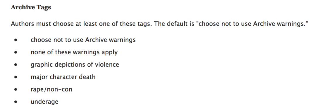 四个默认标签中,两个涉及到强奸或非同意性行为和未成年性行为,另外两个标签是暴力和主要角色死亡| AO3, Terms of Service