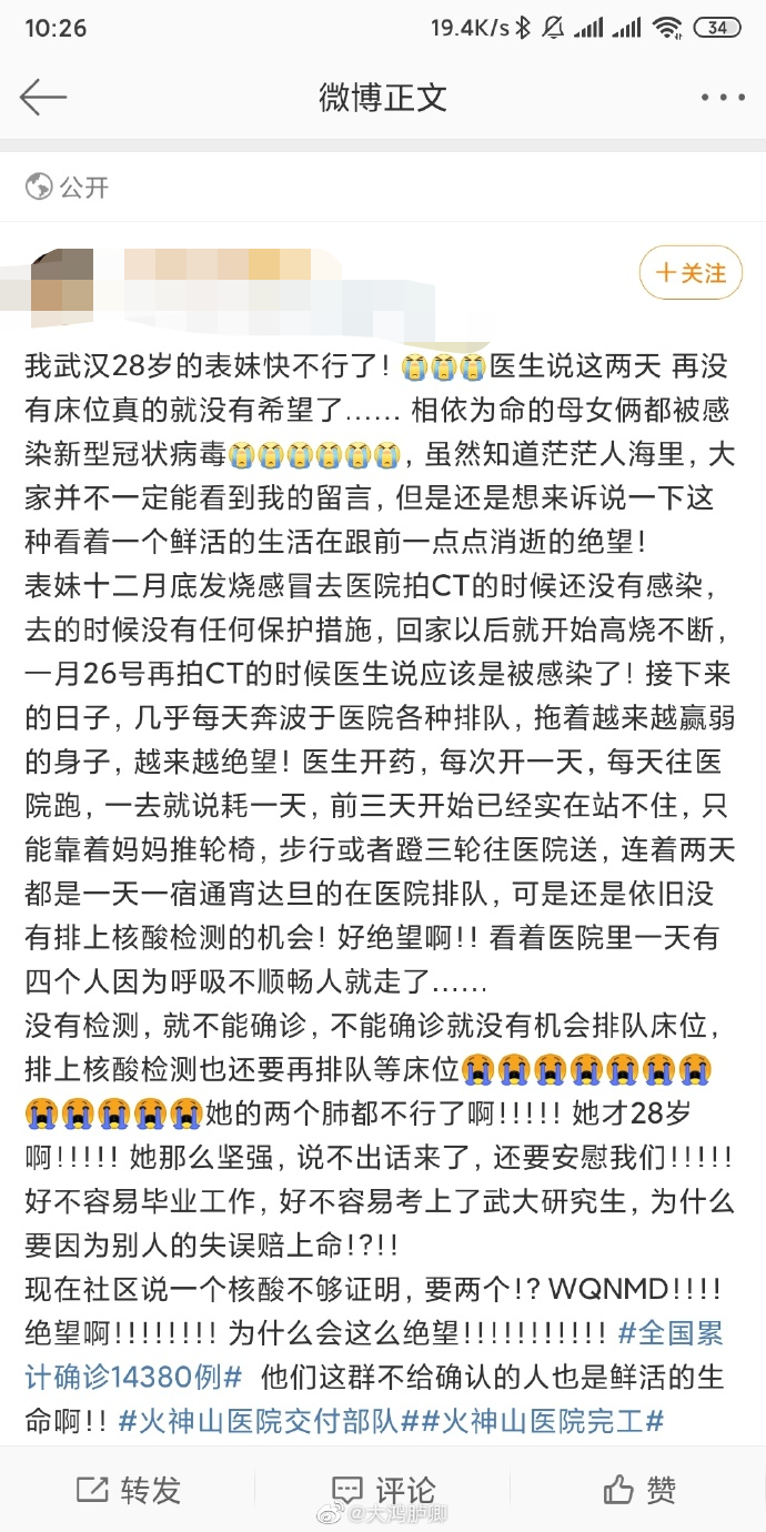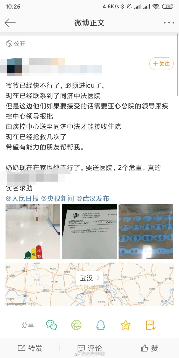 在社交网络上,以“武汉+求救”为关键字进行搜索,能够看到很多无法去医院接受治疗,甚至无法接受核酸检测的武汉人民。