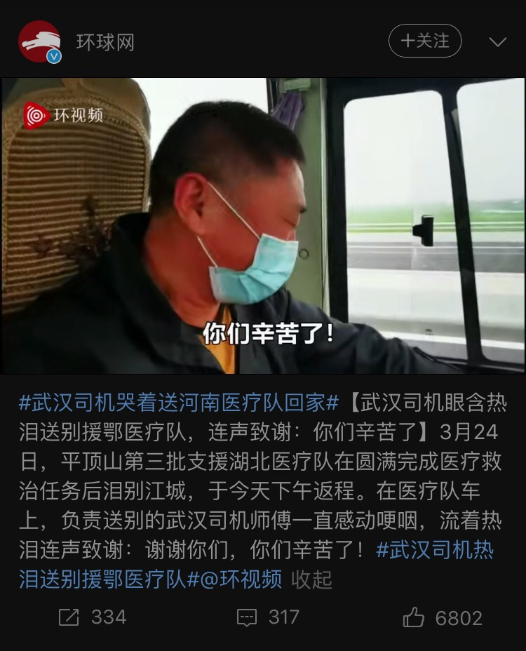 河南平顶山第三批医疗队完成救治任务离开时,武汉司机一边开车一边哭“谢谢你们!你们辛苦了!”。