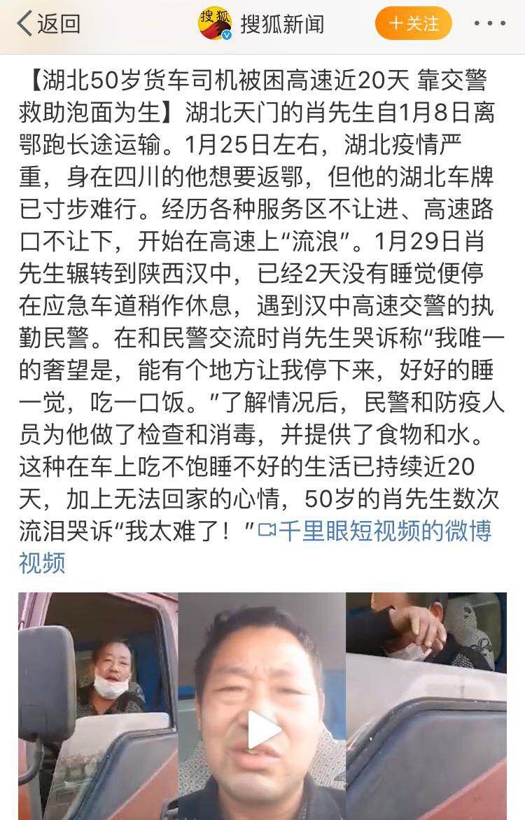 比如这个湖北天门的肖师傅,疫情爆发之前离开湖北跑长途送货,疫情爆发之后却仅仅因为湖北车牌被歧视、驱赶。