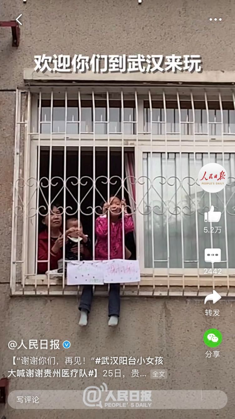 一个小女孩在窗边用稚嫩的声音大喊:“谢谢你们啦!欢迎你们到武汉来玩!”,楼下的医疗队员也跟这位小女孩挥手再见。